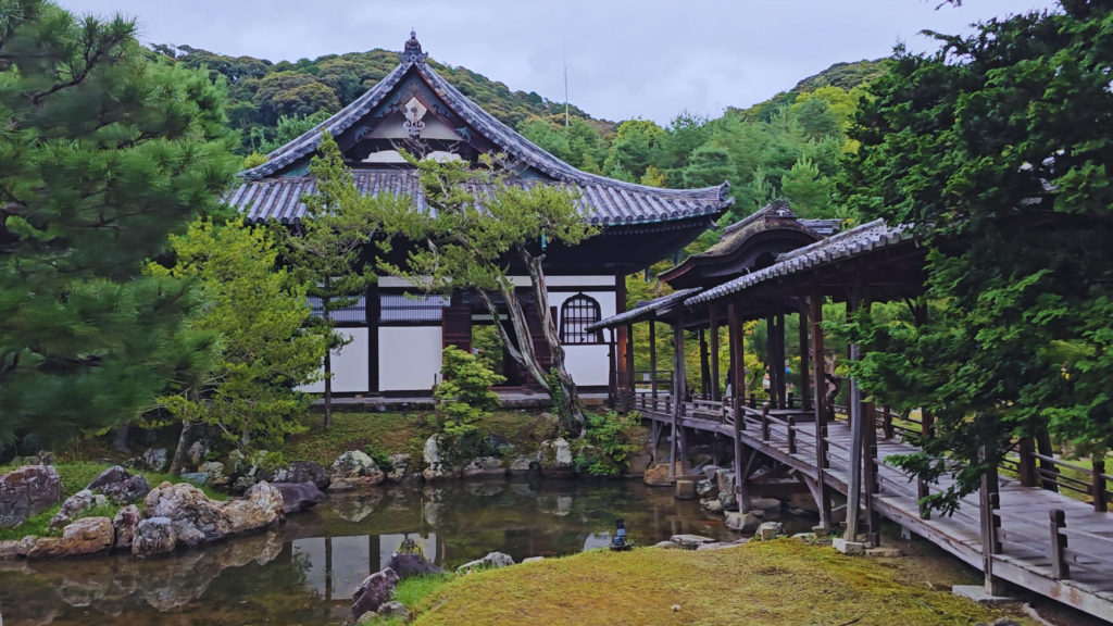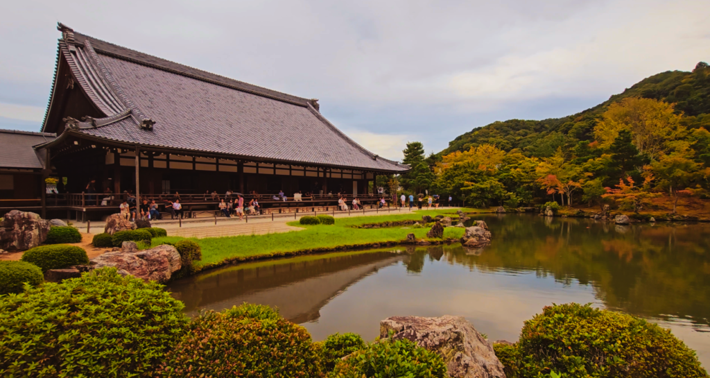 Aquí no hay nada al azar. El lago central, las piedras, los árboles, las montañas de fondo… todo está colocado con una intención brutal. Es lo que se llama “paisaje prestado”: usan la naturaleza real (las montañas de Arashiyama) como parte del propio diseño.
