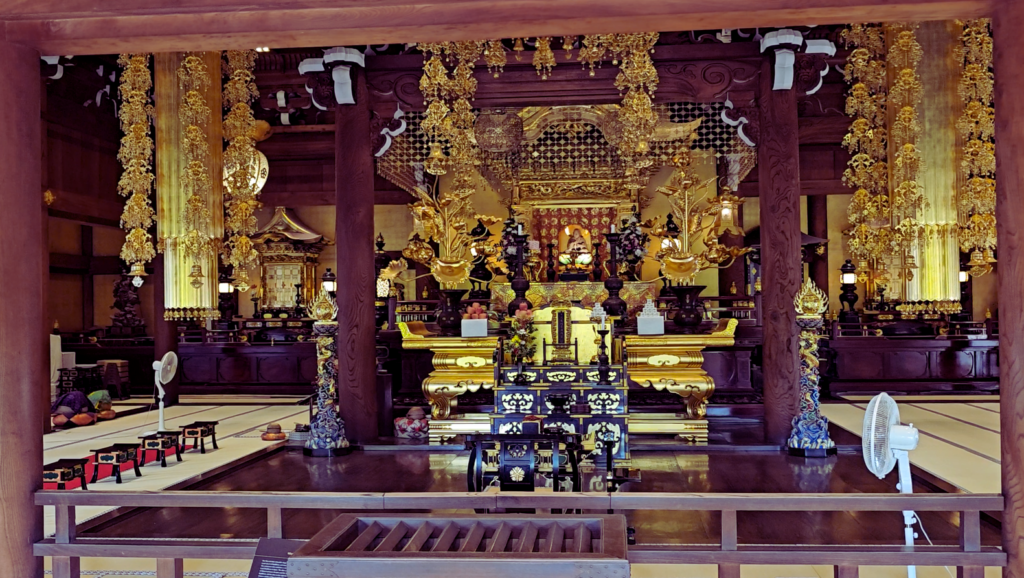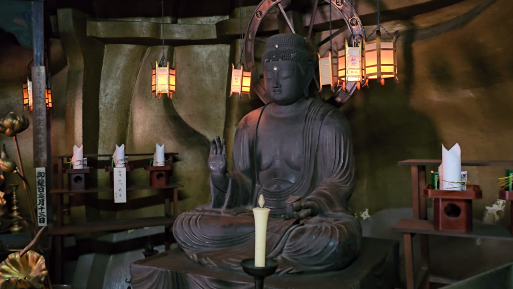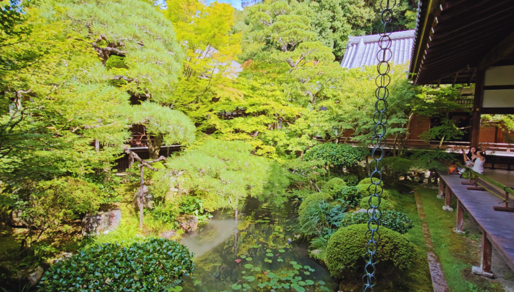 Pero Eikandō no es solo exterior. Por dentro también tiene algo especial, con pasillos de madera que conectan diferentes salas y te obligan a moverte despacio, observando. Y ahí aparece uno de sus detalles más curiosos: la estatua de Amida mirando hacia atrás, algo bastante único que le da aún más personalidad al templo.