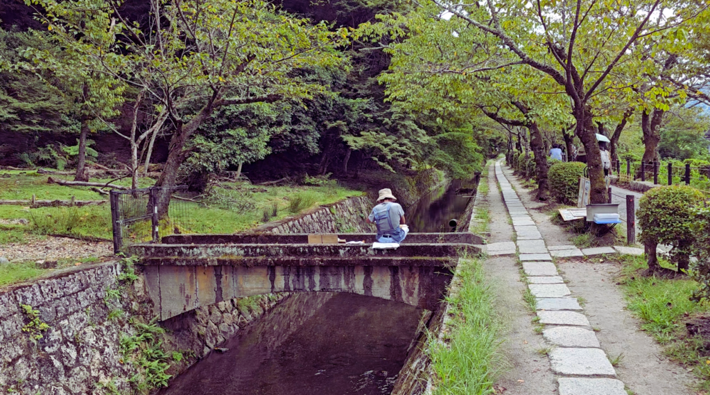 Es un sendero que sigue un canal durante unos dos kilómetros, rodeado de árboles, pequeños templos y rincones que invitan a parar. Aquí no vienes a ver algo concreto. Vienes a caminar. Y parece una tontería, pero en Kioto, donde todo el mundo va corriendo de un templo a otro, eso cambia completamente la experiencia.
