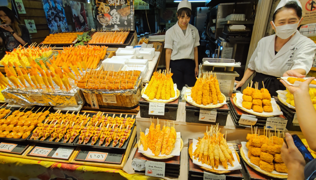 Lo interesante de Nishiki es que mezcla lo turístico con lo local de una forma bastante natural. Sí, hay visitantes, claro. Pero también ves japoneses comprando ingredientes, probando cosas o simplemente pasando. No es un parque temático. Es un mercado que sigue funcionando como tal.