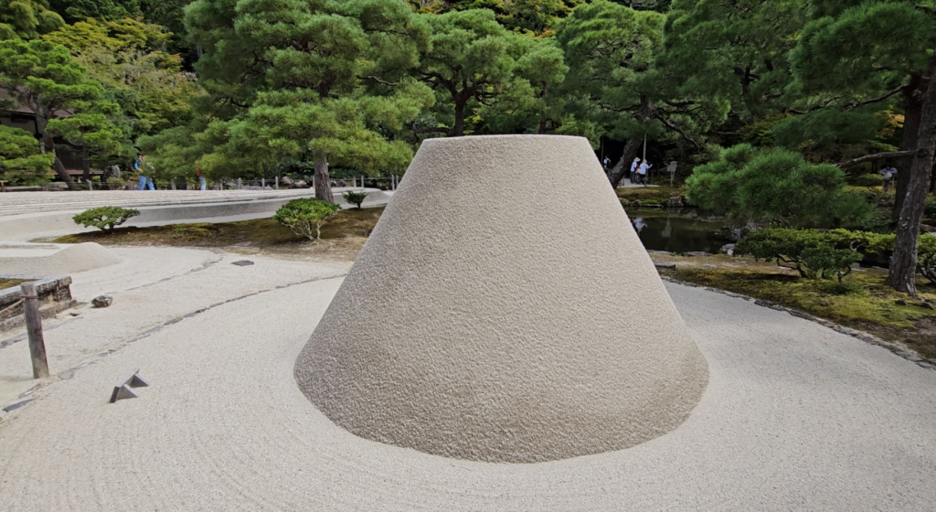Nada más entrar, te encuentras con uno de los elementos más icónicos del templo: ese jardín de arena blanca perfectamente rastrillada, con una especie de cono que parece una escultura minimalista. Es raro, sí. Pero te quedas mirándolo más tiempo del que esperabas.